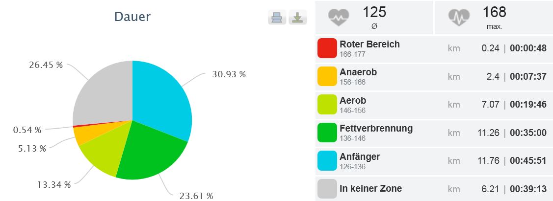 Aus den Zeitanteilen Fettverbrennung und Aareob, d.h. die Muskulatur arbeitet sauerstoffgestützt, lässt sich ersehen, dass rund ein Drittel der Zeit zur Fettverbrennung verwendet werden konnten. Aufgrund der fehlenden Konstanz des Windes und damit auch „Verdrängerfahrten“ bleibt der größte Anteil als Cardio-Training. Auch sichtbar wird, dass alle Cardio-Typen angesprochen werden.